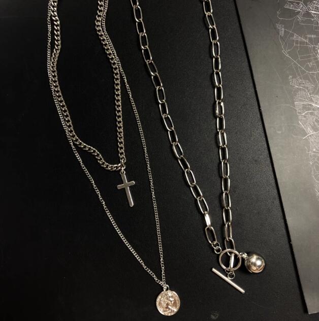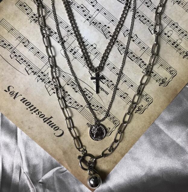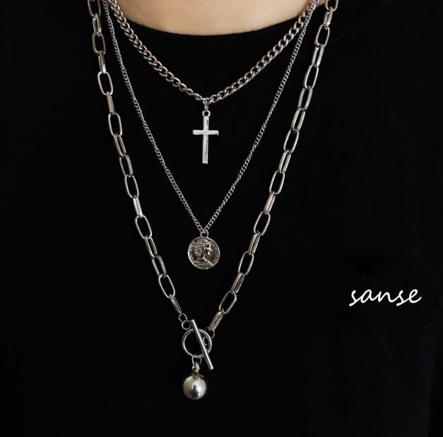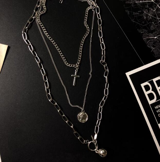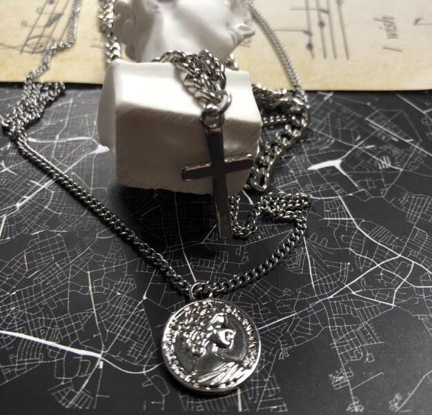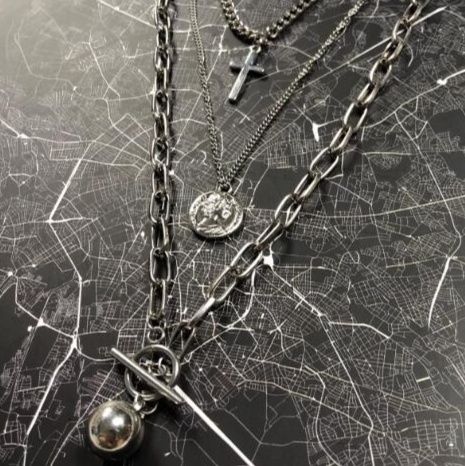 十字架、コイン、球体の3つのペンダントが異なるチェーンに配され、洗練された印象を与えます。
