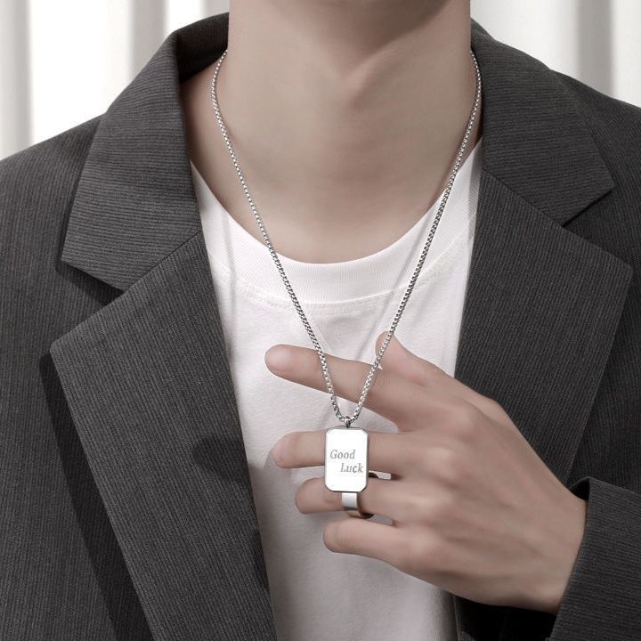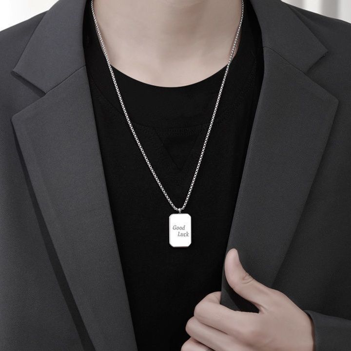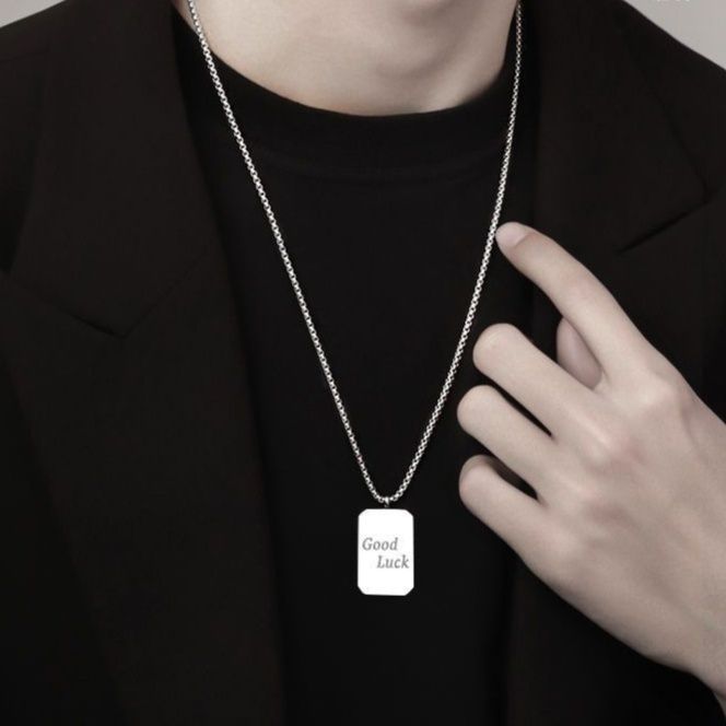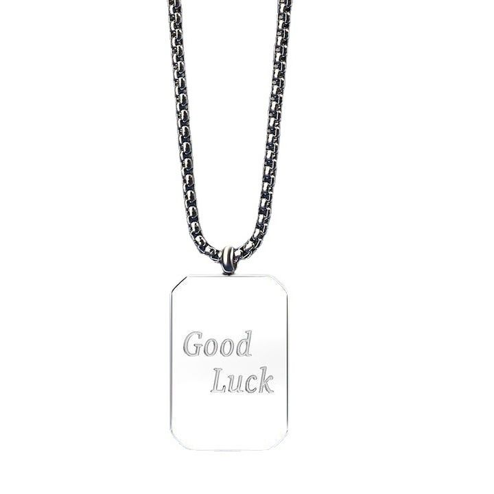 シンプルな長方形のプレートに幸運を願うメッセージが刻まれた、メンズアクセサリーとして人気のネックレスです。
