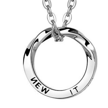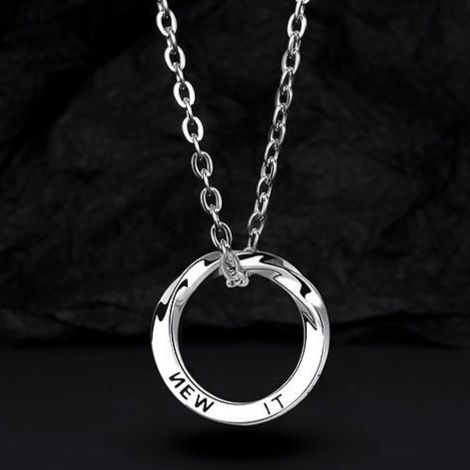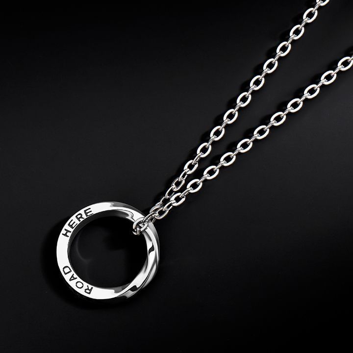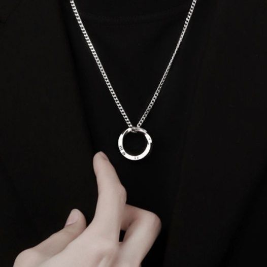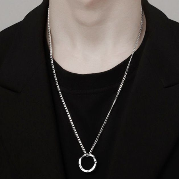 シンプルな円形リングに文字が刻印された洗練されたデザインのネックレスです。